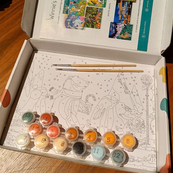 The kit is designed for children 9 and up, and it comes with everything they need: a sturdy 9.5" x 7" canvas board, acrylic paints, three brushes, step-by-step instructions, and a picture of the finished painting. No prep, no mess-panic, no “where’s the brush?” moments.