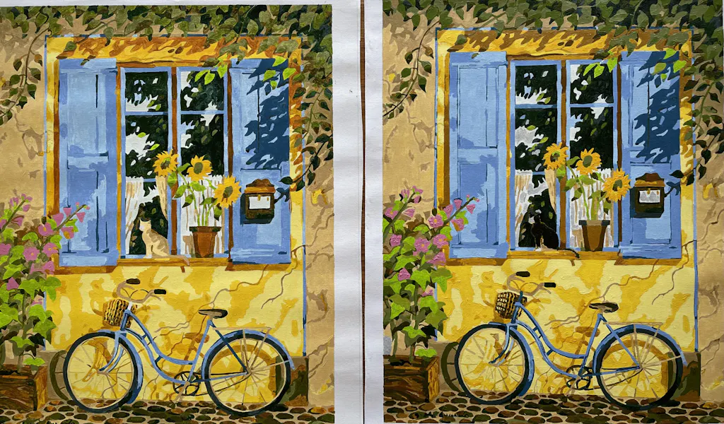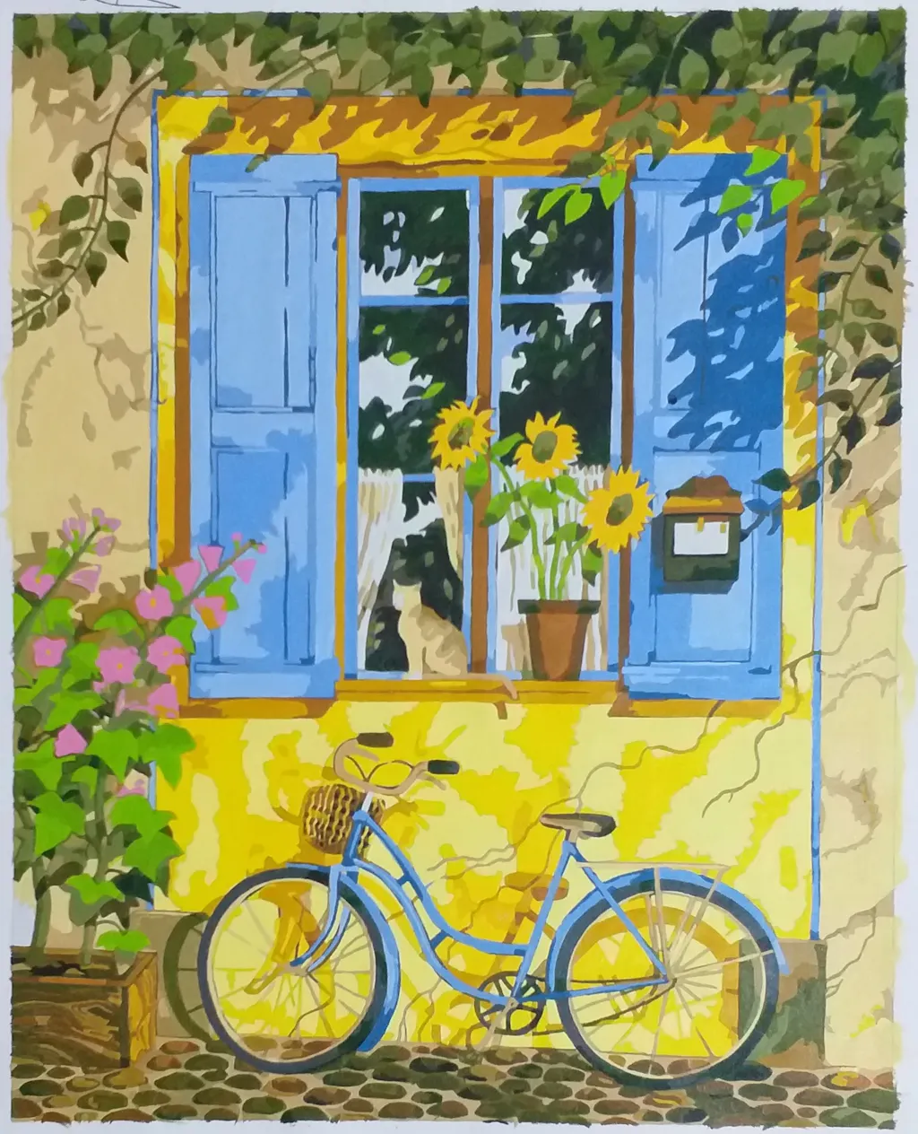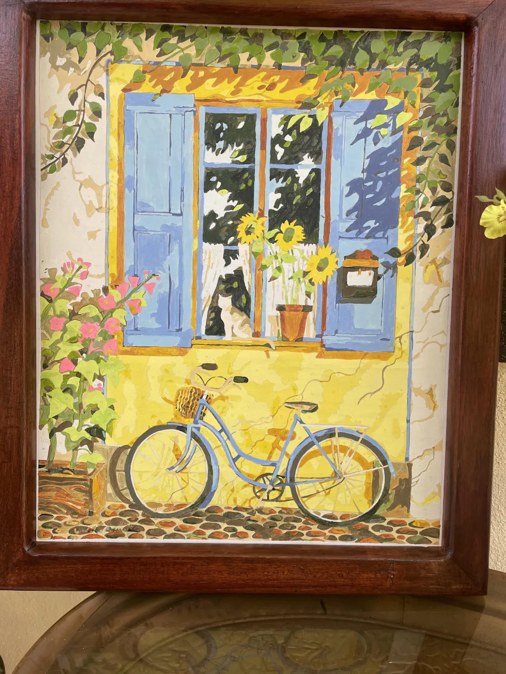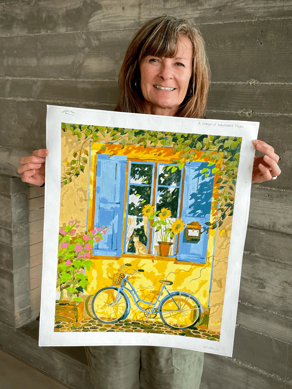 Les peintures de Robin Wethe Altman sont facilement reconnaissables par leurs tons vifs et colorés. Américaine, originaire de Californie, cette artiste a fait une place de choix au jaune et au bleu dans son œuvre, rappelant le sable et l’océan de son enfance. « Une femme indépendante » en est l’exemple parfait : ces deux couleurs associées au soleil, à l’eau et aux vacances prédominent dans ce tableau. Celui-ci représente la devanture d’une jolie petite maison de campagne, dont on aperçoit une fenêtre aux volets bleus. Sur le rebord de celle-ci, un chat observe la maisonnée, assis à côté d’un pot de tournesols d’un jaune vif. Une bicyclette bleue est posée sur le mur et attend que son propriétaire l’enfourche pour aller se balader à travers les champs. La fenêtre est surplombée par une belle glycine pendante, projetant une ombre délicate sur les volets. La palette de couleurs est diversifiée car on peut aussi observer sur cette toile des roses trémières en fleurs. Accrocher cette peinture dans sa maison, c’est, assurément, y faire entrer le soleil !