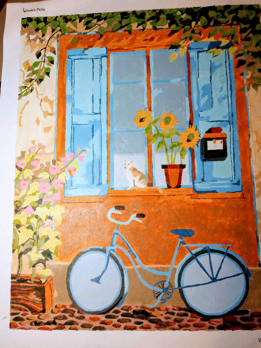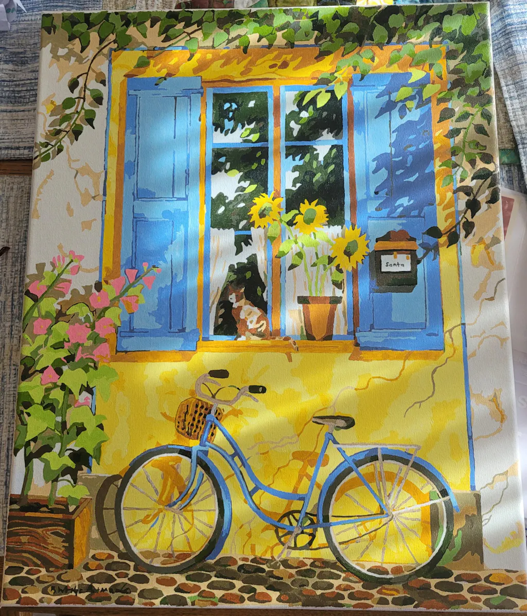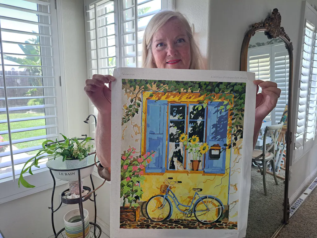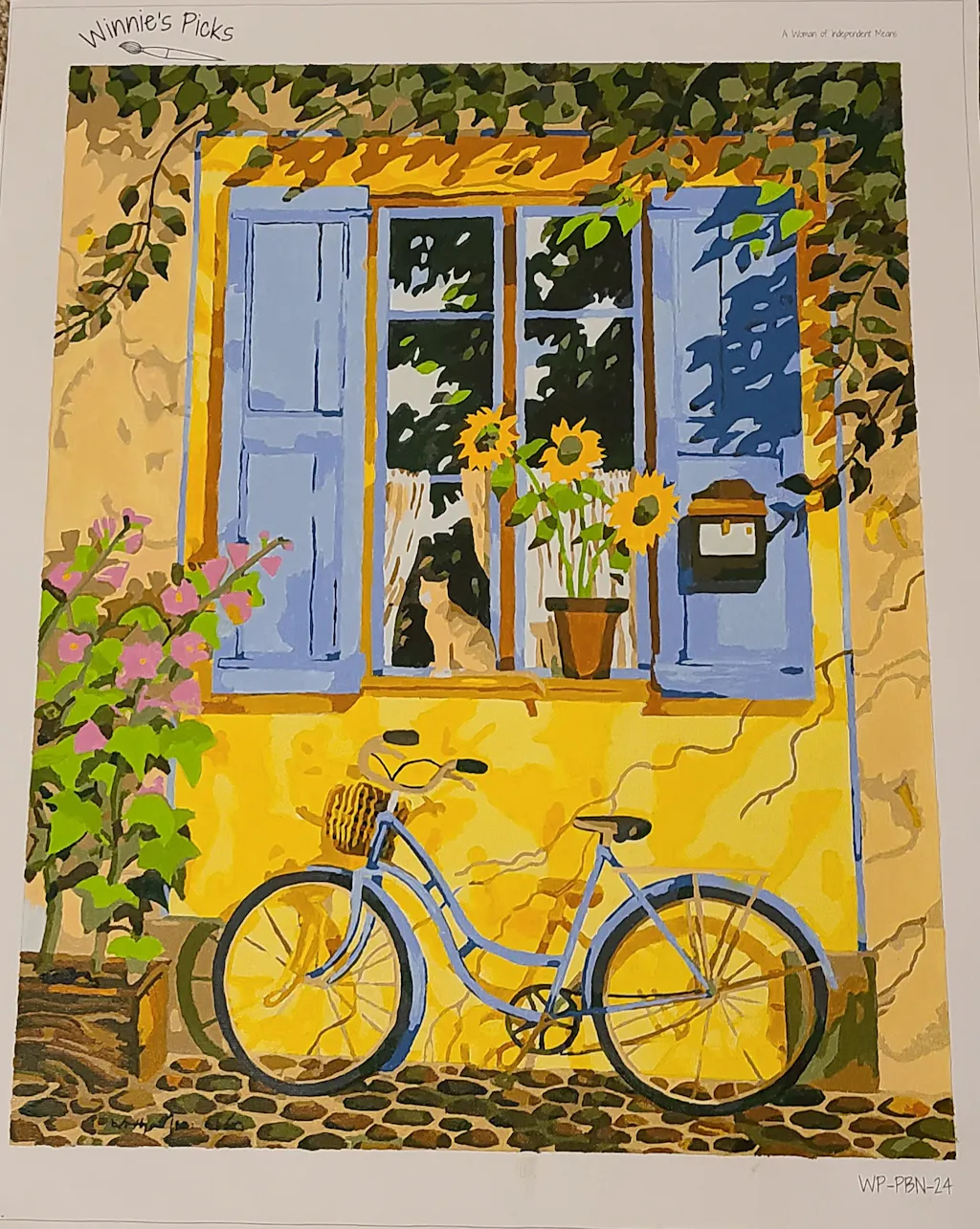 Les peintures de Robin Wethe Altman sont facilement reconnaissables par leurs tons vifs et colorés. Américaine, originaire de Californie, cette artiste a fait une place de choix au jaune et au bleu dans son œuvre, rappelant le sable et l’océan de son enfance. « Une femme indépendante » en est l’exemple parfait : ces deux couleurs associées au soleil, à l’eau et aux vacances prédominent dans ce tableau. Celui-ci représente la devanture d’une jolie petite maison de campagne, dont on aperçoit une fenêtre aux volets bleus. Sur le rebord de celle-ci, un chat observe la maisonnée, assis à côté d’un pot de tournesols d’un jaune vif. Une bicyclette bleue est posée sur le mur et attend que son propriétaire l’enfourche pour aller se balader à travers les champs. La fenêtre est surplombée par une belle glycine pendante, projetant une ombre délicate sur les volets. La palette de couleurs est diversifiée car on peut aussi observer sur cette toile des roses trémières en fleurs. Accrocher cette peinture dans sa maison, c’est, assurément, y faire entrer le soleil !