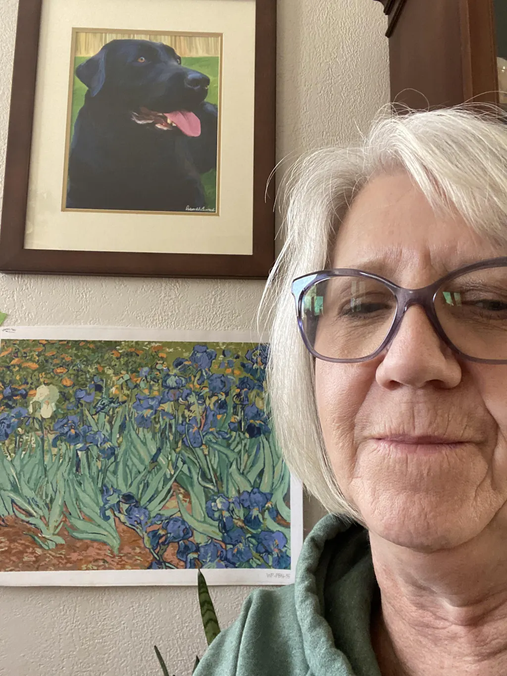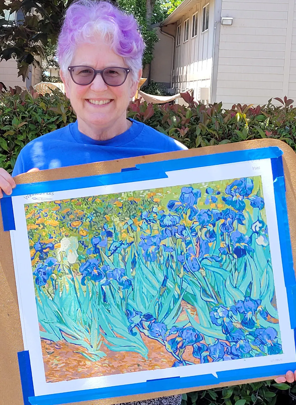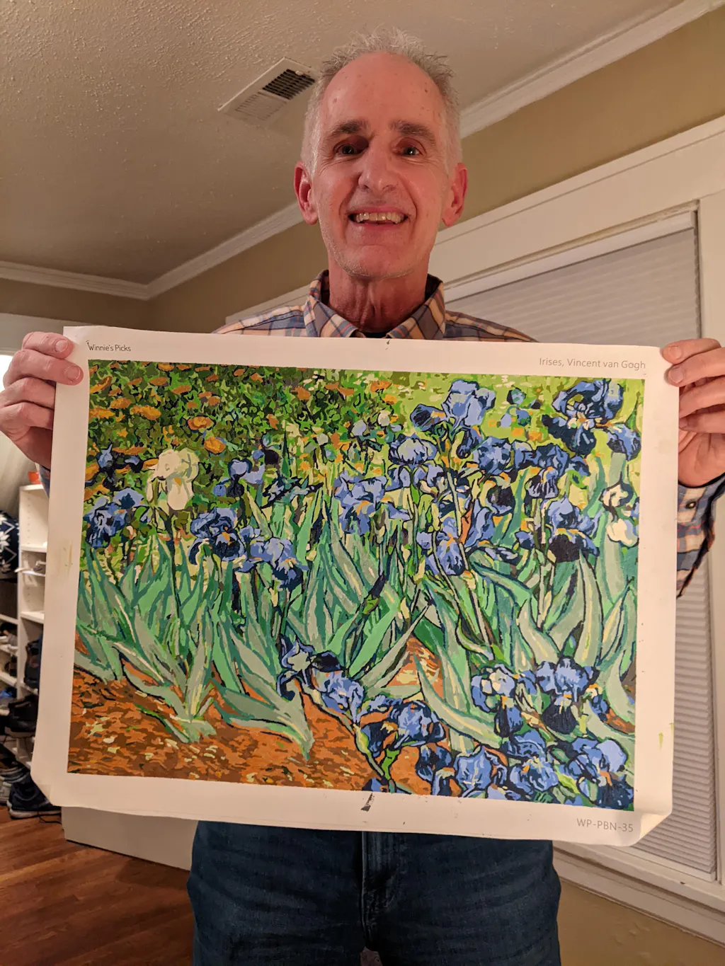 He painted it on the same easel used for the Starry Night paint-by-numbers. He used a gradient of blue and violet to bring the petals to life and green tones to match the leaves. Only one white Iris stands in the middle, with a bush of poppies in shades of orange behind it. Some yellow touches here and there materialize the center of the Irises and shades of the flowers behind the irises' flowerbed.