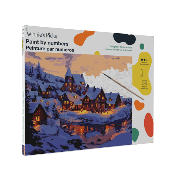Painting it is a journey through light — from the pale amber of the sky to the rich shadows under the roofs. The scene offers just the right mix of challenge and calm, making it ideal for those who enjoy working with subtle color transitions and soft reflections. Every numbered section builds toward that final glow: a snowy village bathed in twilight, perfectly balanced between night and day.